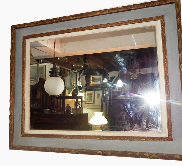 • Grande espelho com moldura em madeira decorada.  med.  85 x 1,08 cm